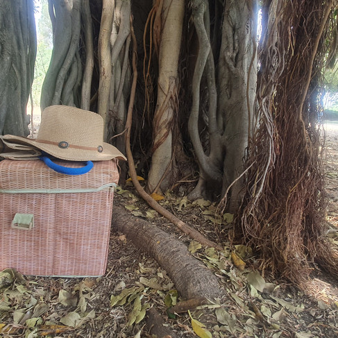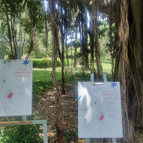 אני אוהבת מקומות שיש בהם כני ציור, שמחכים ליד טובה ועין בוחנת, שיקבלו השראה מהמקום. מצאתי כנים בתחילת הסיור העצמאי בגן הנדיב, כאשר פניתי ימינה, ליד עצים עתיקים, עם שורשים משתרגים עתירי הוד והדר. גיליתי שלא ממש נח לצייר על הכנים שעומדים בשמש ודורשים לעמוד דום מולם