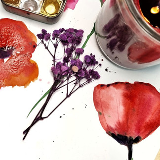מהר מאוד גיליתי שנדרשת יד עדינה ובוטחת, כדי לצייר פרחים. לשחק עם הנזילות שלהם, שמגיבה בהמשכים. היו בנות לידי, שהצליחו נפלא, אז החלטתי להתאמן בבית.אחרי שרכשתי צבעי מים איכותיים במיוחד, בקיט קטן שמתאים גם לנסיעות