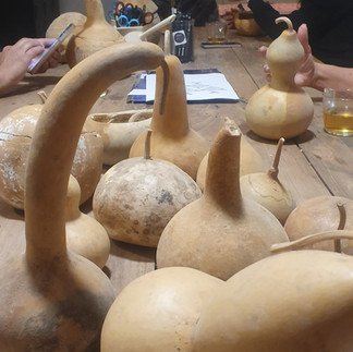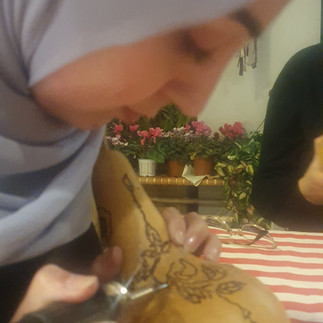 למשל הסדנה שהשתתפתי בה, להכנת עציץ לרקפת מדלעת מקושטת. הרעיון הוא למחזר חומר, כך שגם הזרעים שהיו בדלעת, נכנסו לעציץ בשילוב עם האדמה, ששמנו כמצע מועשר לרקפת ששתלנו. את הדוגמא לעיטור העתקנו בעזרת נייר קופי ובהמשך צרבנו. הצריבה דרשה מיומנות וכח ופחות הסתדרתי איתה. ניתן היה לצייר באקריליק, כך שניסיתי לעקוב אחרי קווי המתאר, של הפרח שיצרתי